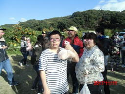 平成29年11月11日(土)冬になり、朝も夜も寒くなりました。そんな中でも、工房きずなの利用者さんは風邪を引くことなく元気に過ごしています。レクリエーションでみかん狩りに行きました。当日は、晴天にめぐまれ、とても過ごしやすかったです。利用者さんは、みかん狩りが始まると自分の食べたいみかんを職員に頼み、取ってもらい、美味しそうに食べていました。もちろん最後にはお土産のみかんをかかえて嬉しそうに持って帰りました。 |